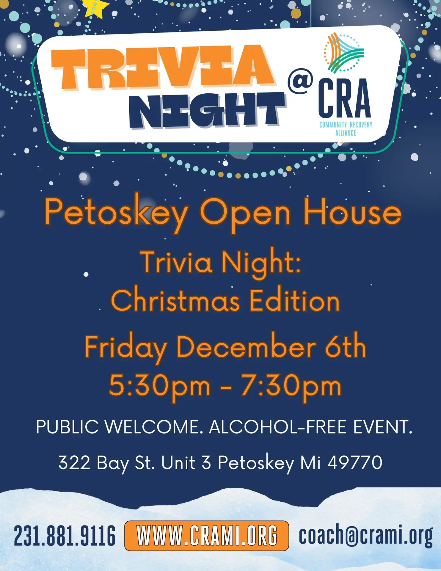 Join CRA during the Petoskey Open House for Christmas Trivia Night. This is an alcohol free event. Trivia Starts at 5:30pm There will be snacks, prizes and a whole lot of fun with members of the recovery community. Everyone is welcome to join.