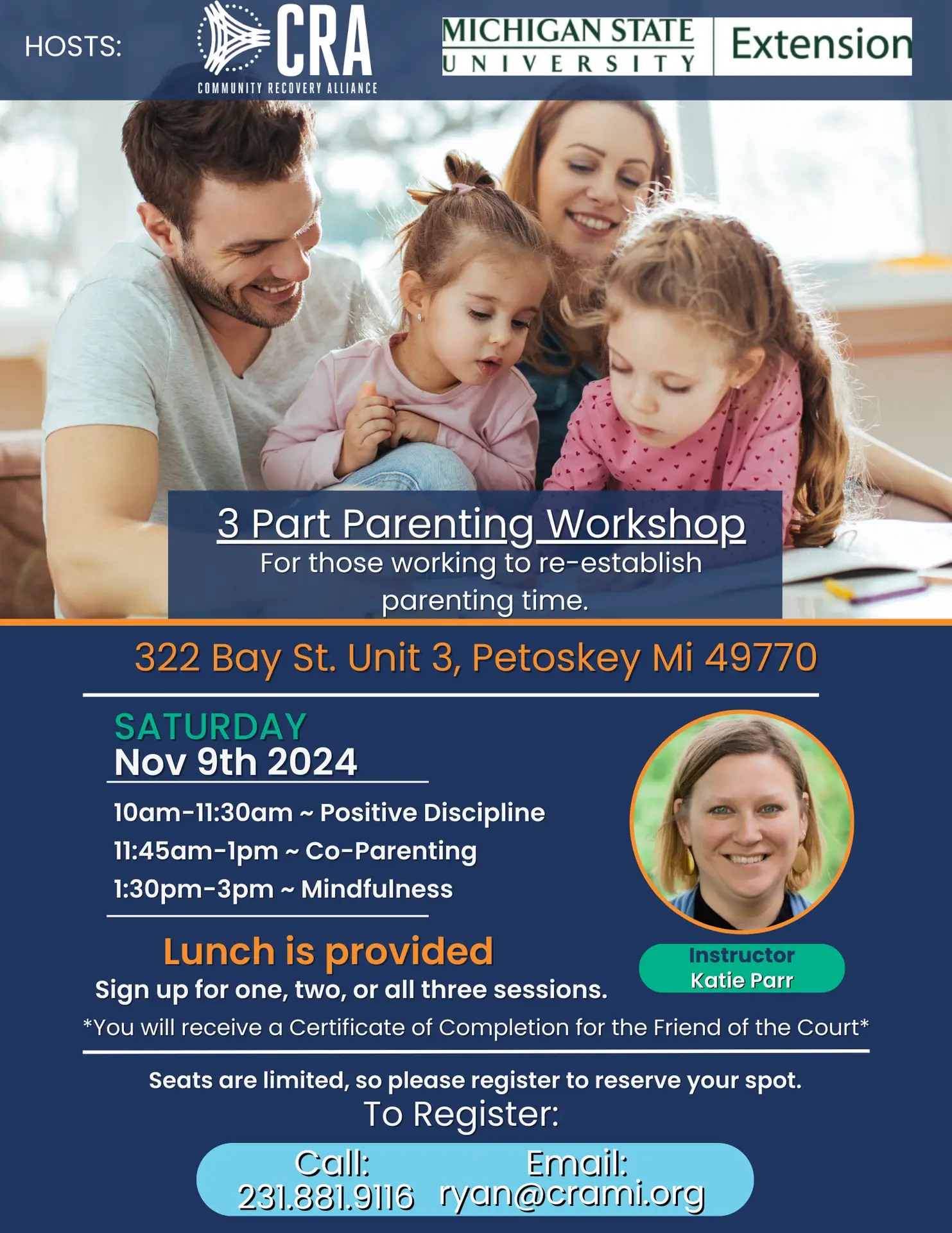 Join CRA and Katie Parr for a 3 Part Parenting Workshop, to help get you closer to re-establishing parenting time. Completion of the training will get you a Certification of completion to provide the Friend of the Court.   Register for one, two, or all three workshops.   10am-11:30am - Positive Discipline 11:45am-1pm - Co-Parenting […]