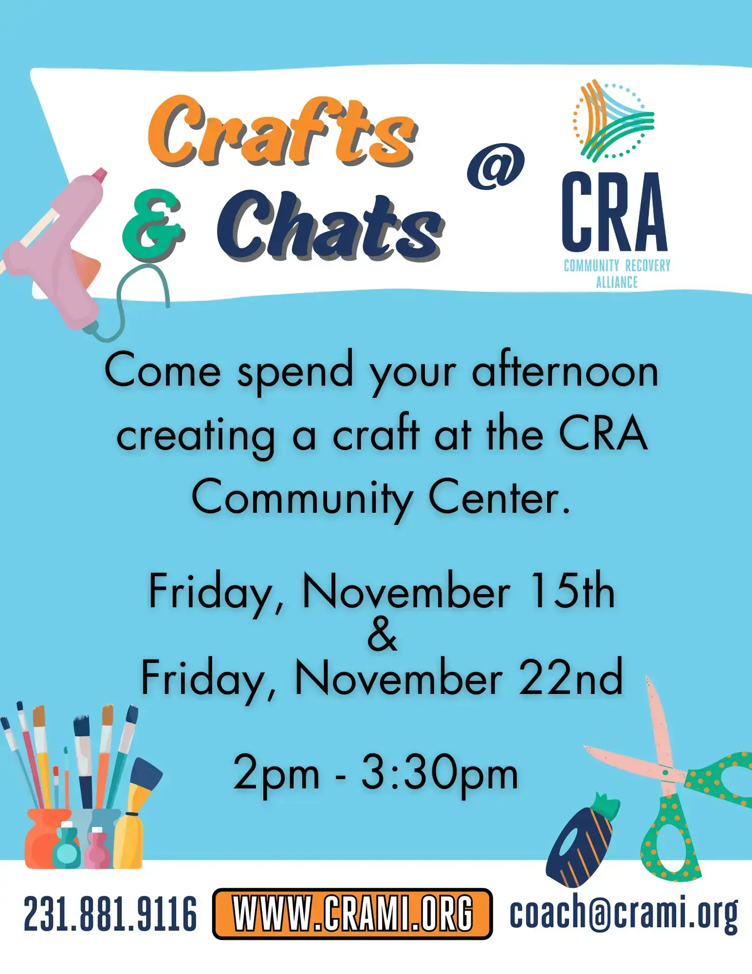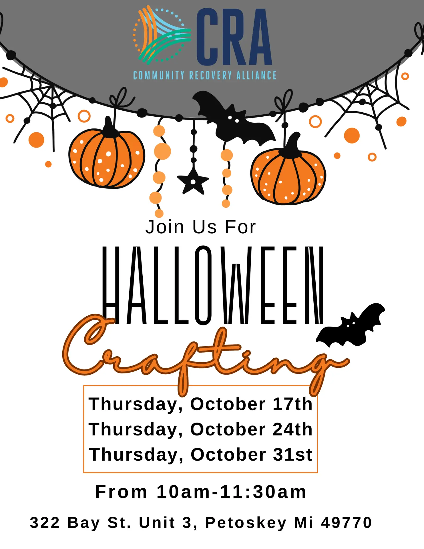 Come Join CRA in October for morning Craft time! October 17th October 24th October 31st No need to Register! Just come and have fun! At the Community Recovery Alliance Community Center 322 Bay St. Unit 3 Petoskey Mi 49770
